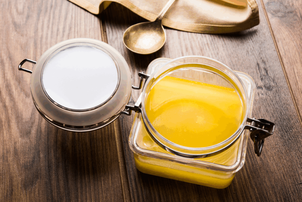 Il ghee, pronunciato “ghi”, è burro chiarificato portato all’estremo. Si ottiene scaldando lentamente il burro per separare e rimuovere completamente acqua, lattosio e caseina lasciando solo la componente grassa pura. Il risultato è un grasso al 99 percento senza proteine del latte né zuccheri, di colore giallo dorato e consistenza cremosa che si solidifica a temperatura ambiente.