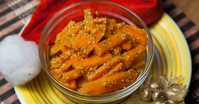 Bastoncini di carote saltati con ghi, sesamo e spezie. Un contorno profumato, saporito e sfizioso.