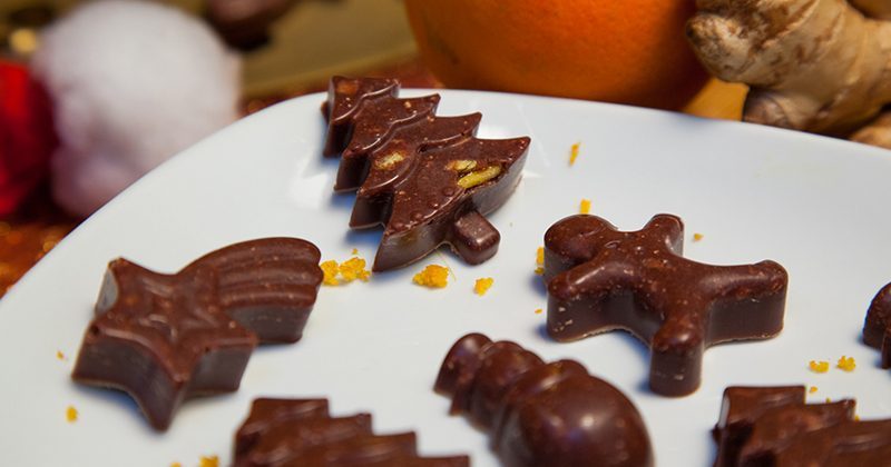 Cioccolatini al cacao crudo in una variante che profuma di Natale, con zenzero fresco e scorza d’arancia.