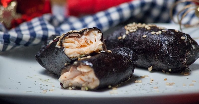 Filetto di salmone cotto al punto giusto, avvolto in un foglio di alga nori. Una ricetta raffinata che delizia sia gli occhi che il palato.