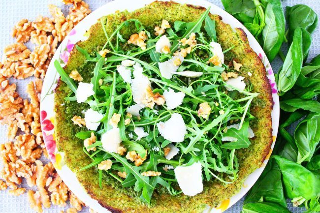 Una “finta” pizza per gustare i broccoli in modo originale con un gustoso condimento di rucola, pesto, noci e Parmigiano.