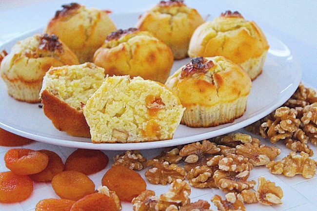 Muffin con albicocche e banana che non contengono altri zuccheri oltre a quelli della frutta, sono nutrienti e sazianti, ottimi come dessert, spuntino e una sana merenda per i bimbi.