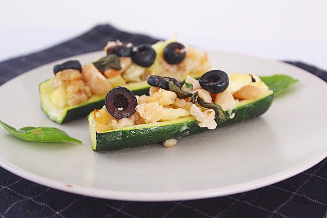 Gustose zucchine ripiene in versione vegetariana con un ripieno di fagioli cannellini e olive.
