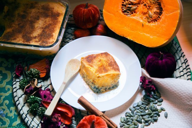 Per questa occasione, ho creato questo delizioso e semplicissimo dolce alla zucca che fa il verso alla classica cheesecake all’americana.