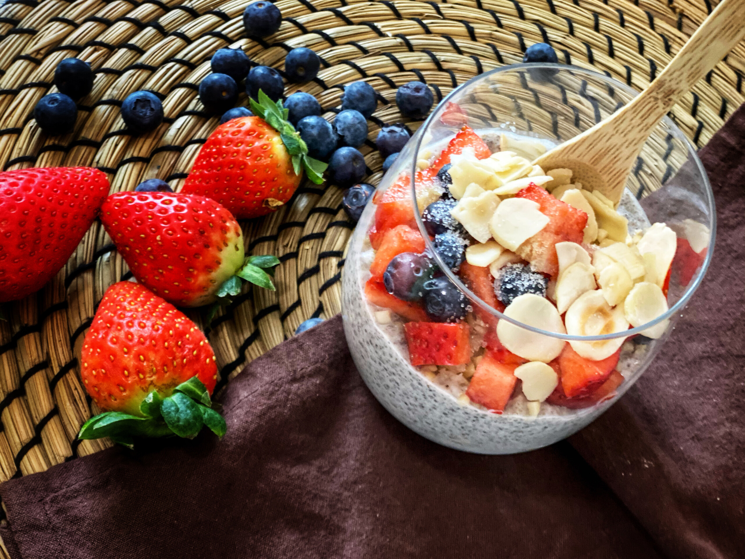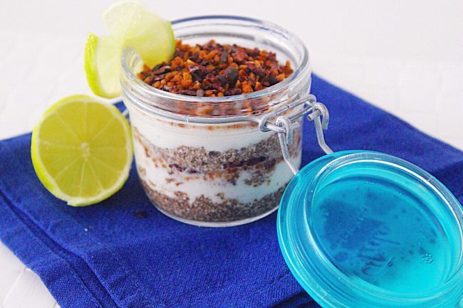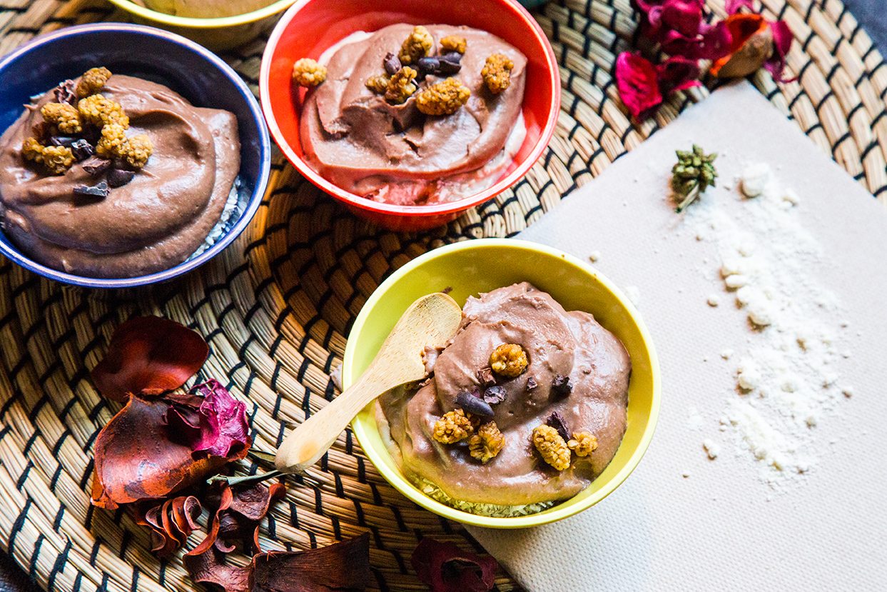 Delizioso ed energetico questo budino è arricchito dalle proteine nobili dei semi di chia, dalla granella di cacao crudo e dalle more di gelso.