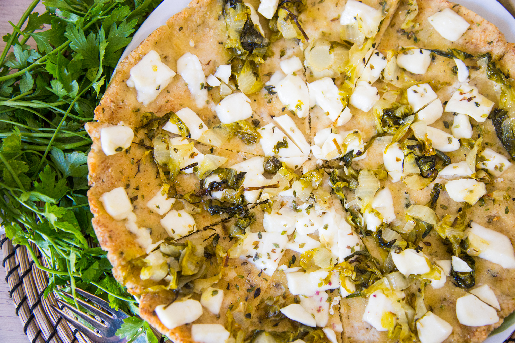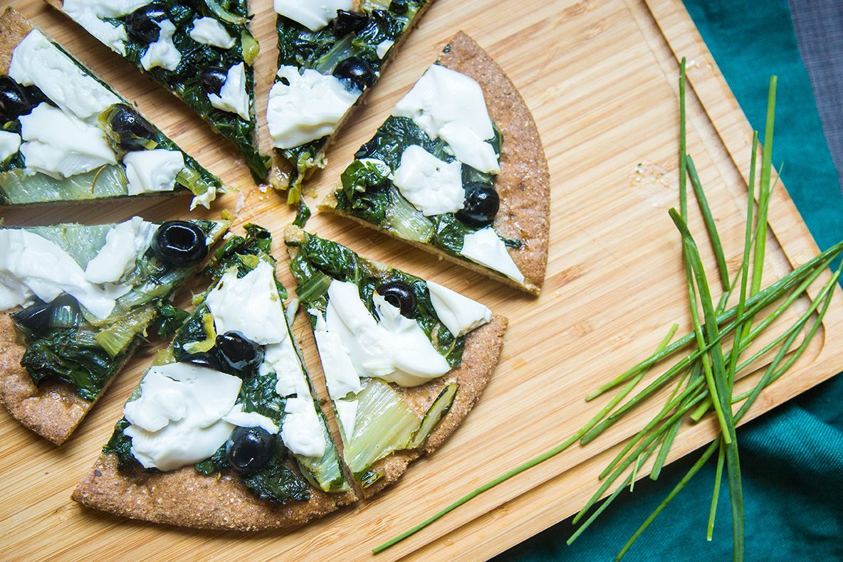 Questa pizza di ceci, soffice e gustosa, può essere condita come vuoi: con formaggetta di capra e bietole, come ho fatto io oppure, se sei vegetariano, con verdure e olive.