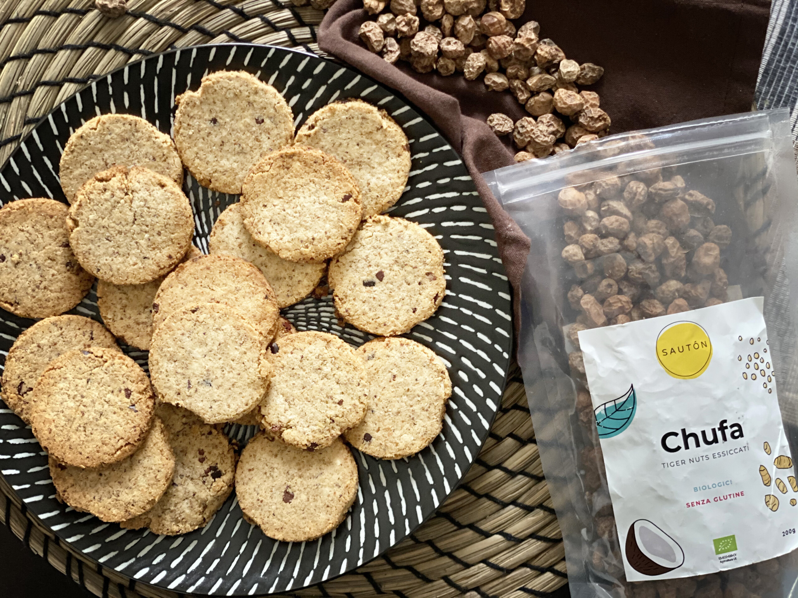 Questi sono dei deliziosi biscotti di chufa arricchiti con pepite di cacao.