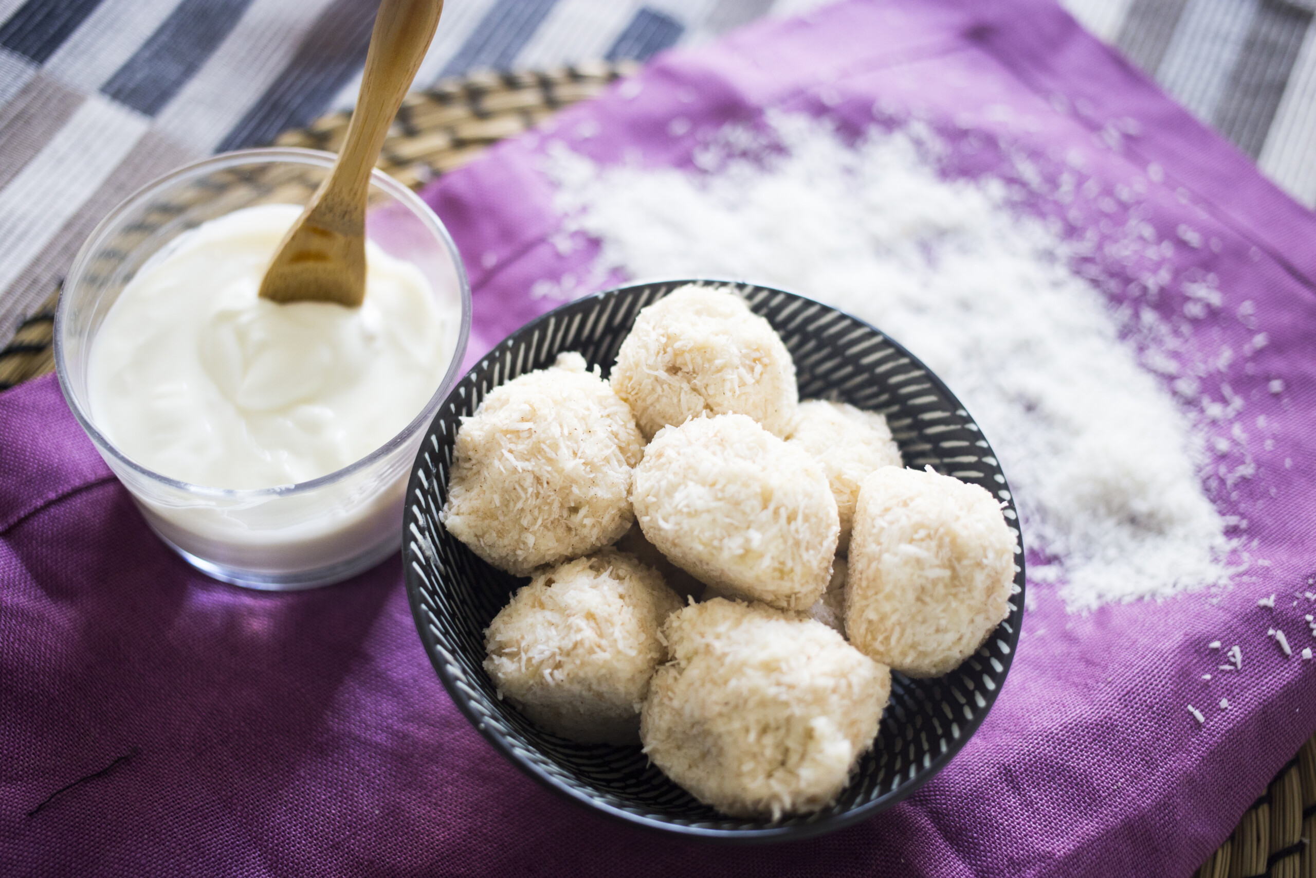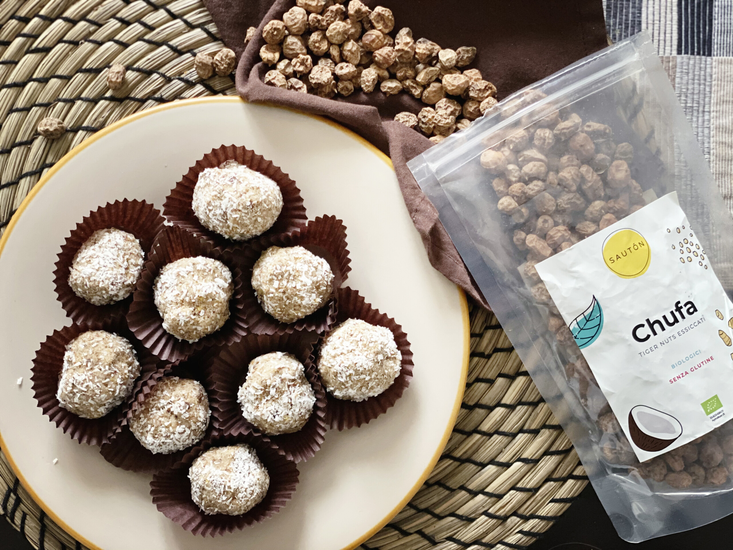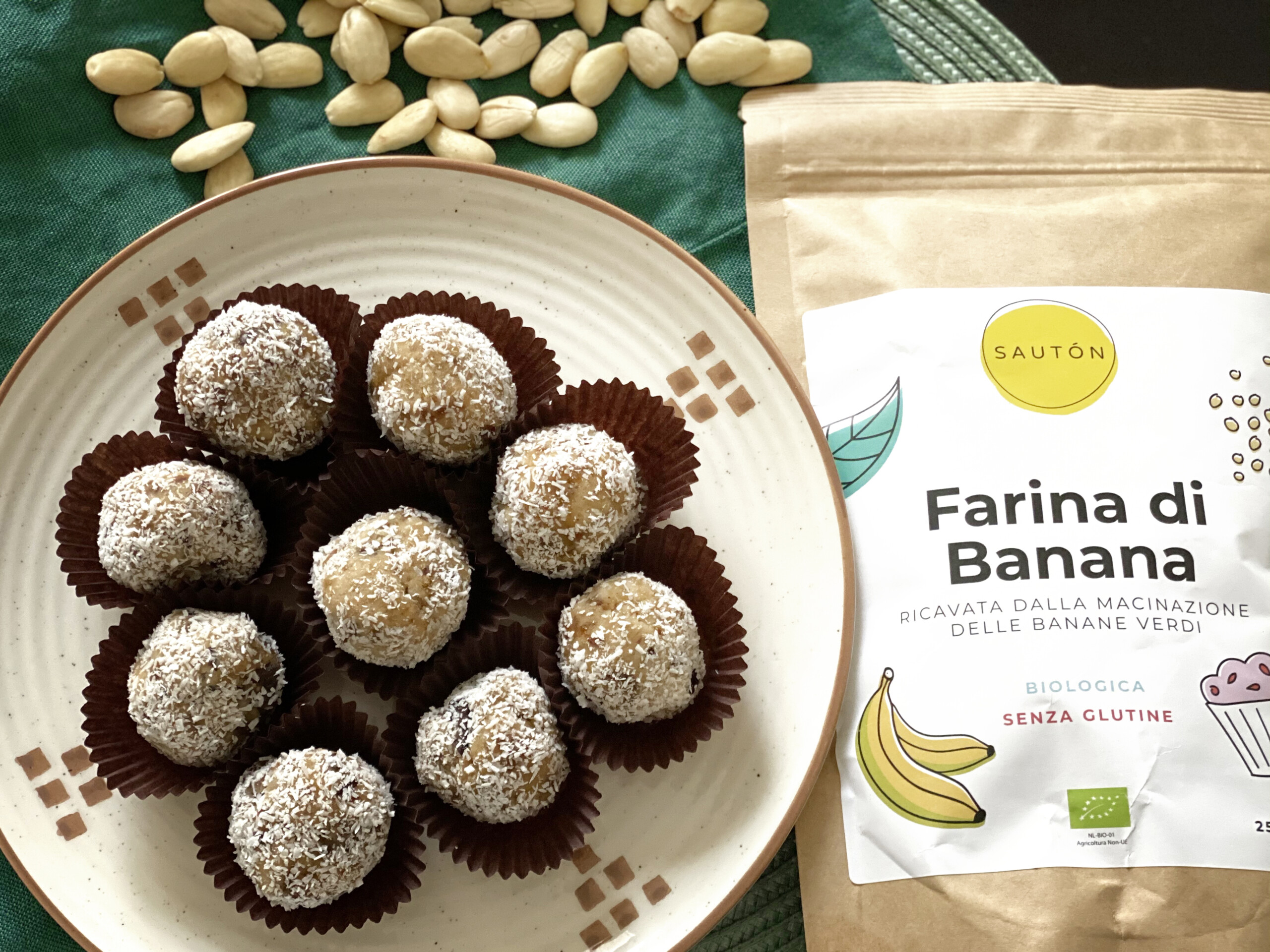 Questa volta le ho fatte con farina di banana verde, proteine vegetali e ricoperte di goloso cocco rapè.
