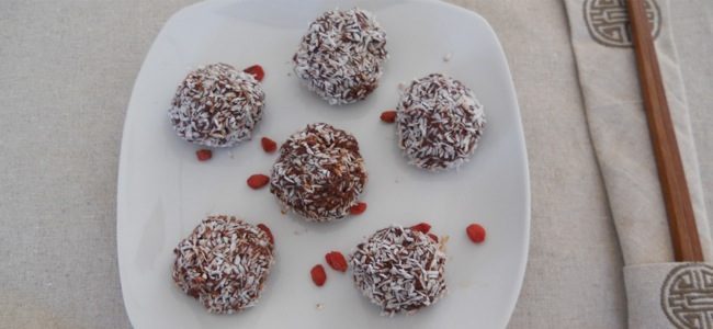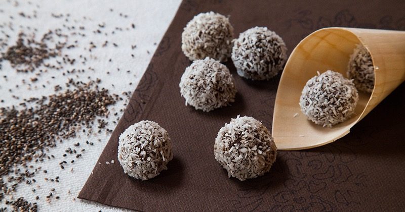Dolci palline con maca, semi di chia e olio di cocco: uno spuntino proteico ed energetico.