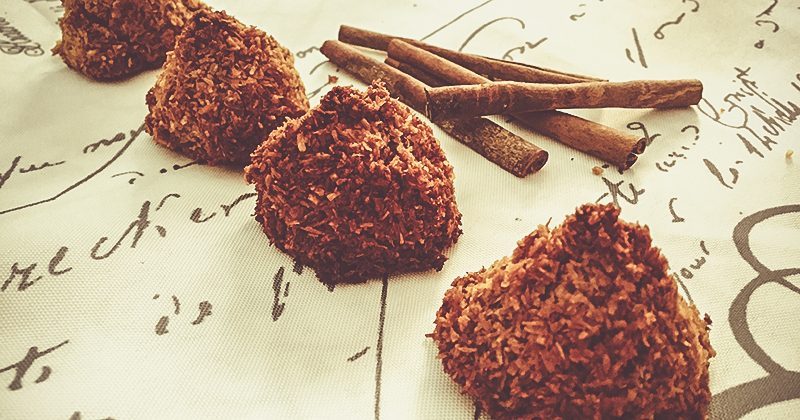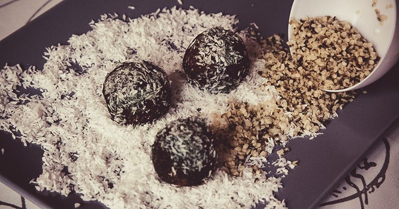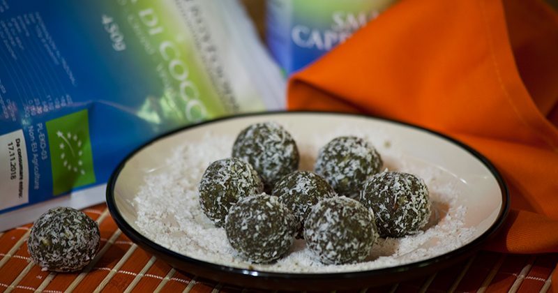 Palline dolci con canapa, cocco e chlorella, uno spuntino proteico, vitaminico e rimineralizzante.