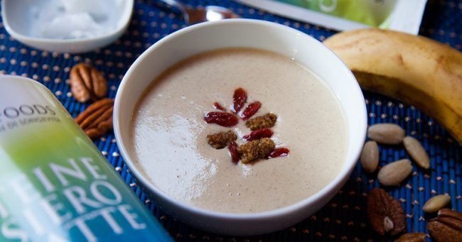 Cremoso porridge proteico di semi e banana, senza fiocchi di cereali.