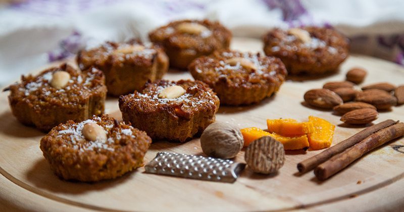 Gustosi muffin in cui la morbidezza della zucca avvolta nel latte di cocco si sposa con la granella di noci pecan e il profumo di cannella e noce moscata.