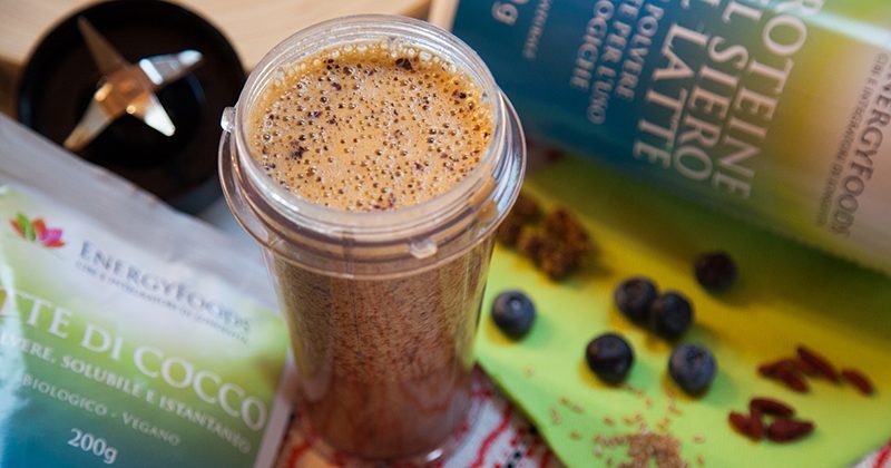 Smart cappuccino proteico con bacche di goji e semi di chia.