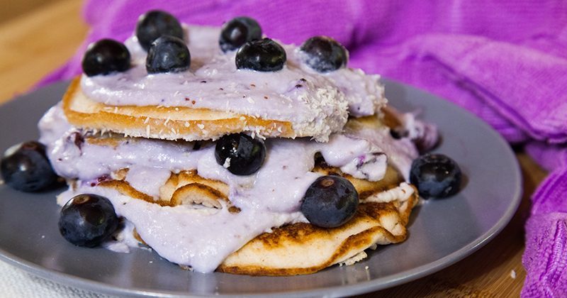 Soffici e dolci pancakes senza farina con crema di cocco e mirtilli.