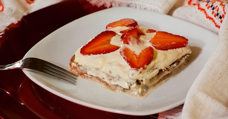 Goloso tiramisù alle fragole fatto con biscotti leggeri di cocco e mandorle.