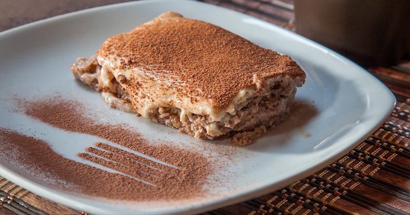 Goloso tiramisù al cacao crudo con biscotti leggeri di cocco e mandorle.