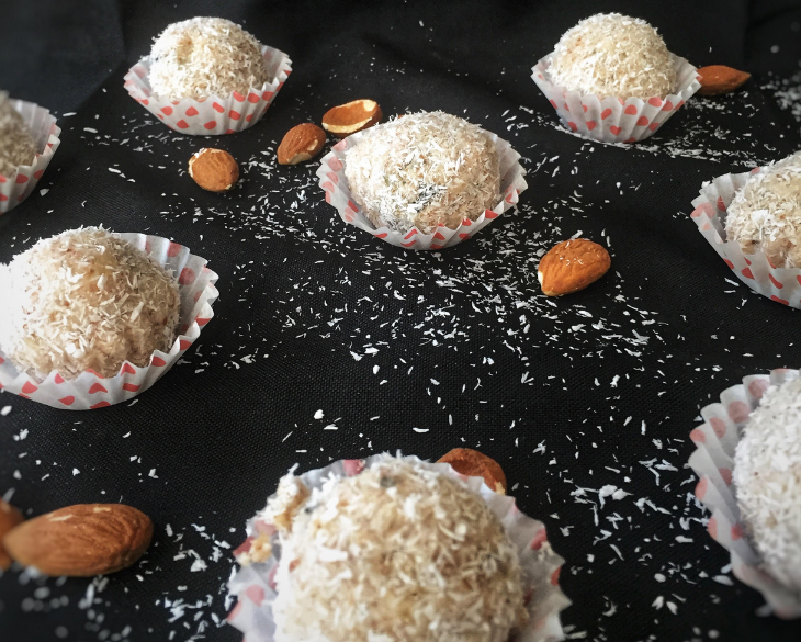 Accessori: Frullatore, Frigorifero Procedimento Mescola gli ingredienti in frullatore. Crea delle palline con il composto e ripassale nel cocco rapè. Puoi conservarle in frigorifero.