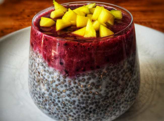 Mousse di cocco e semi di chia ai lamponi: una golosa variante naturale del classico dessert.