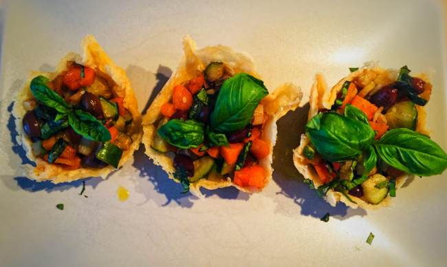 Croccanti gusci di Parmigiano con un “ripieno” di verdure colorate e saporite; ottimi per deliziare amici e parenti e per una colazione salata da gourmet.