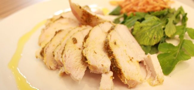 Gustoso pollo aromatizzato con sale, olio evo, limone, curcuma e senape.