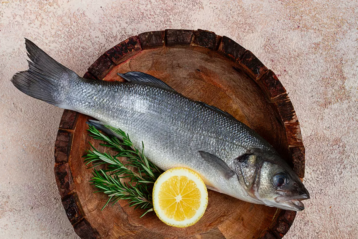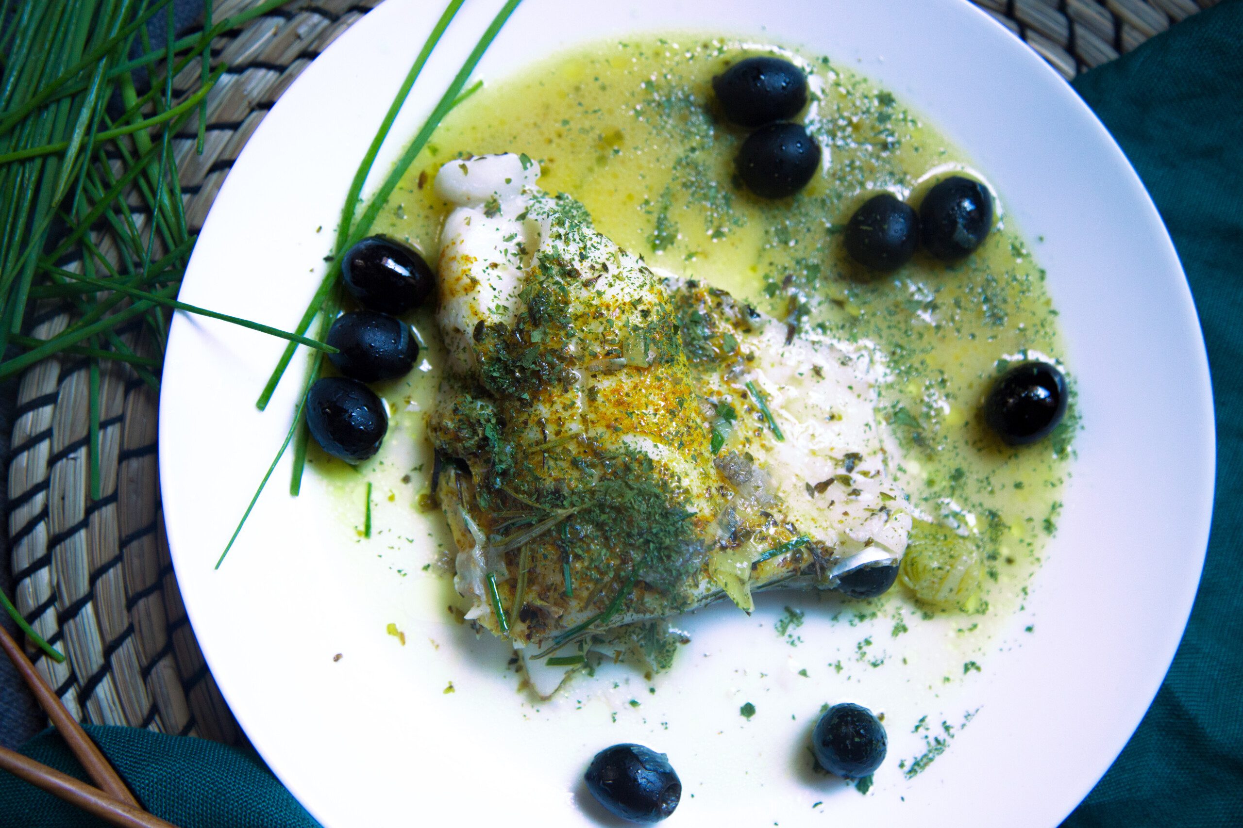 Branzino al forno aromatizzato con spezie ed erbe aromatiche.