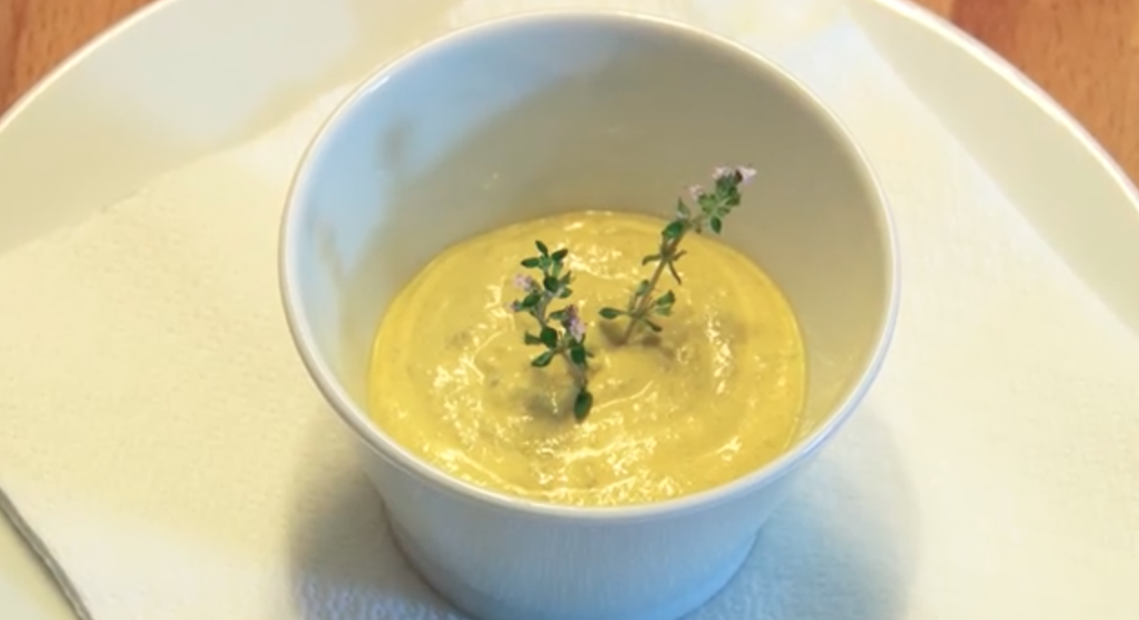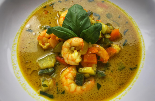 Una deliziosa zuppa di pesce e verdure dalle note tropicali.
