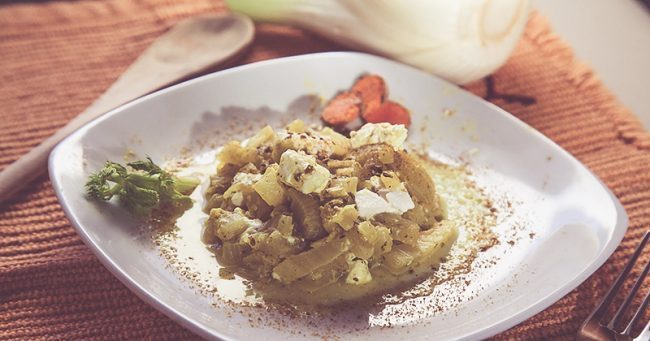 Delizioso finocchio saltato con le spezie e arricchito da pezzettini di feta.