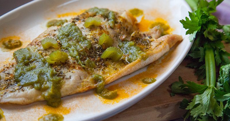 Gustoso filetto di pesce da servire con una divertente salsina di sedano, scalogno e ghi.