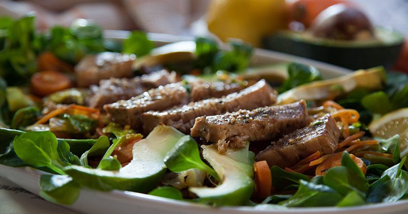Lattuga, rucola e valeriana con avocado, tonno e semi di sesamo.