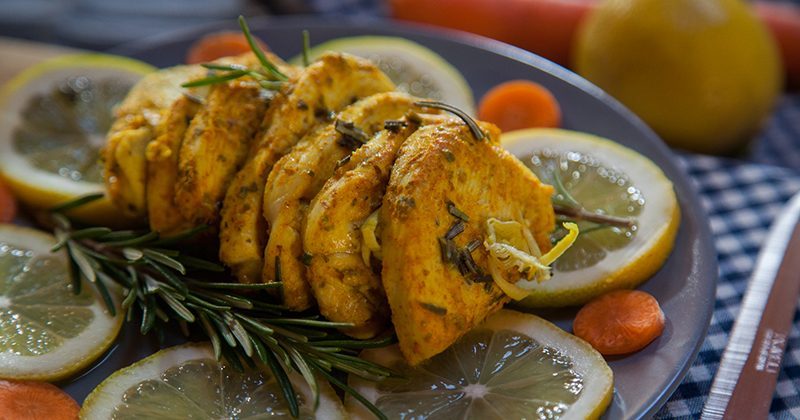 Gustoso pollo marinato con limone, spezie e rosmarino, facilissimo da preparare.