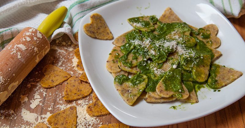 Cuoricini di semi di lino e farina di ceci con pesto di basilico e prezzemolo.