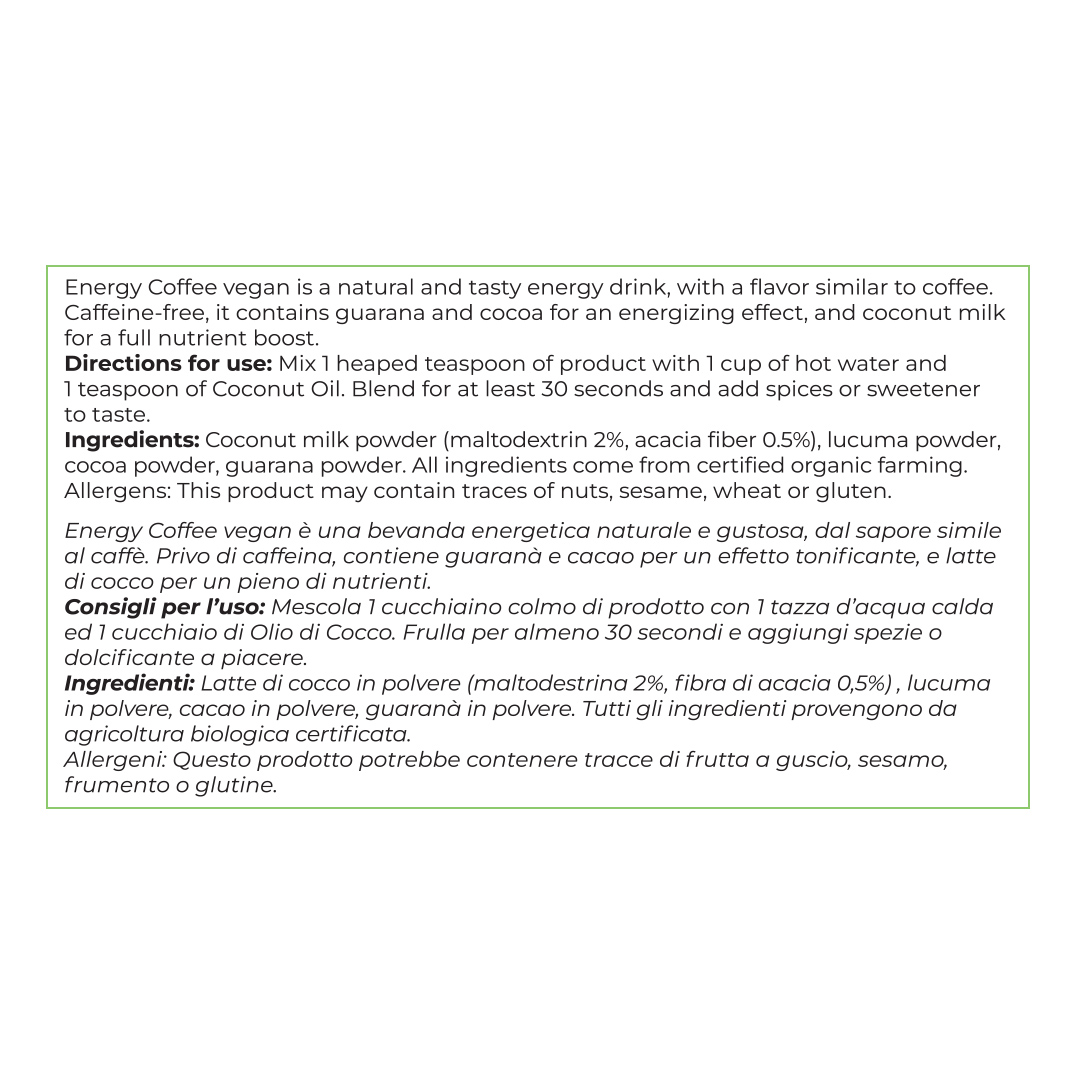 Frullare per 15-30 secondi 1 cucchiaino colmo di Energy Coffee Vegan con 180-200 ml di acqua calda e 1 cucchiaino olio di cocco. Se preferisci una consistenza più cremosa, puoi aggiungere anche 1 cucchiaino di burro di cocco. Puoi diminuire l’acqua se desideri la consistenza di un coffee ristretto.