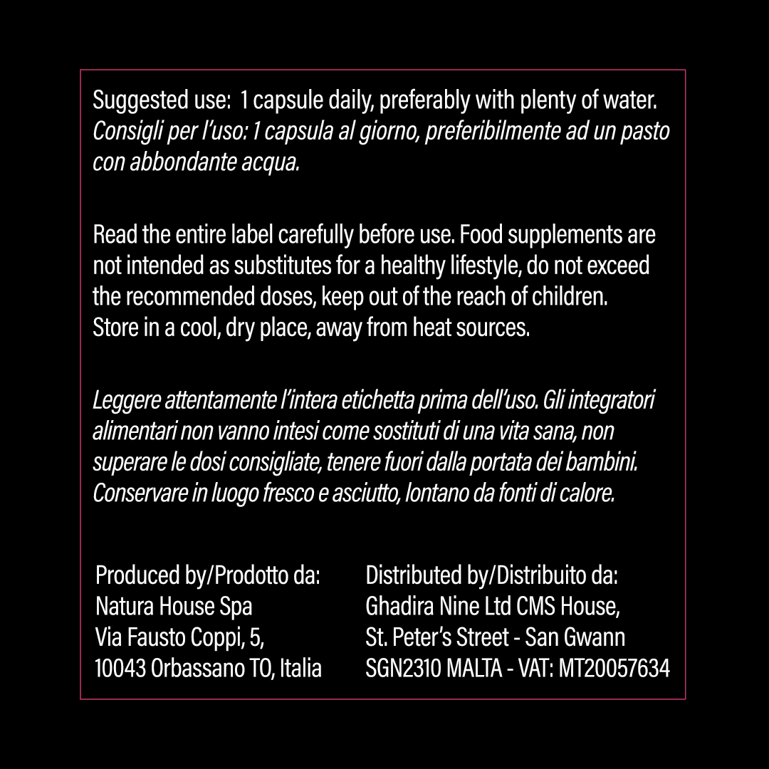 1 capsula al giorno, preferibilmente ad un pasto con acqua.