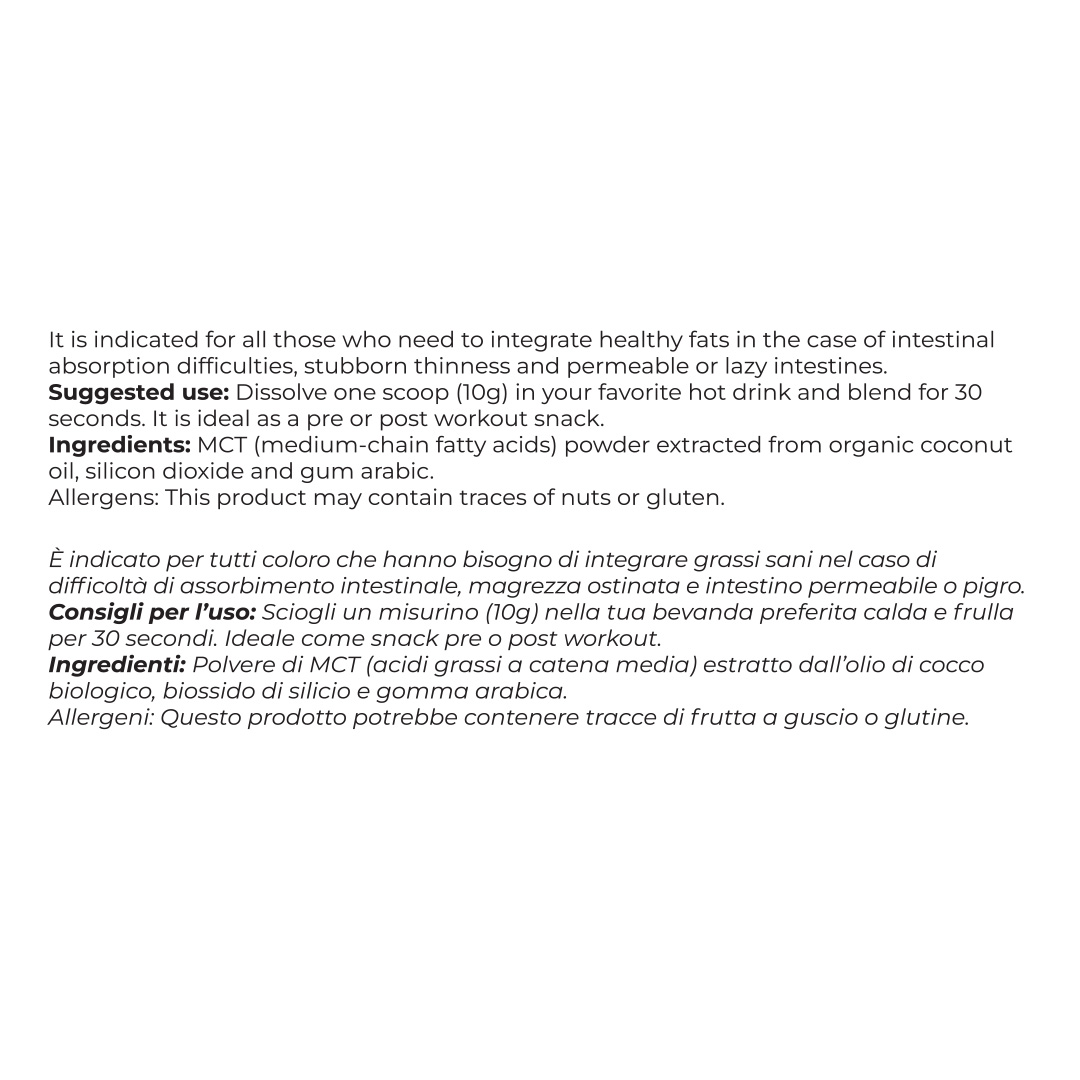 Prodotta da olio di cocco biologico. È costituito da una miscela di acidi grassi a catena media (MCT), digeribili e fonte di energia di immediata disponibilità.