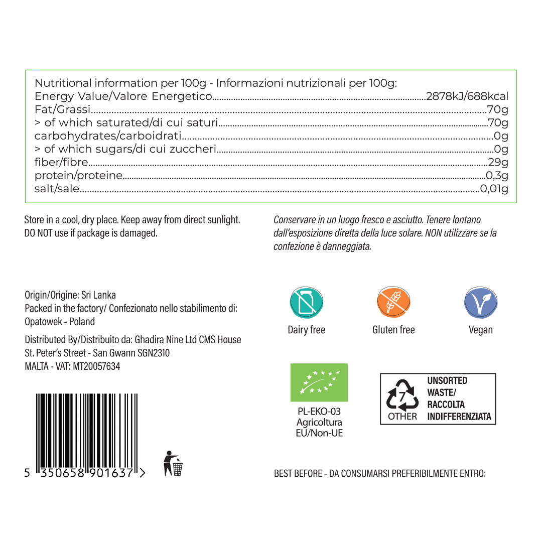 Olio di cocco vergine, premuto a freddo e biologico. È un prodotto al naturale che non subisce sbiancamenti, processi termici o chimici.