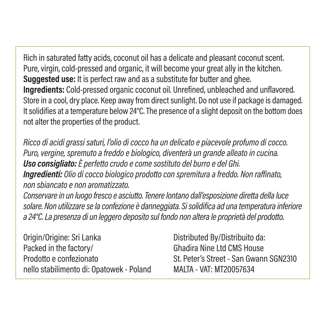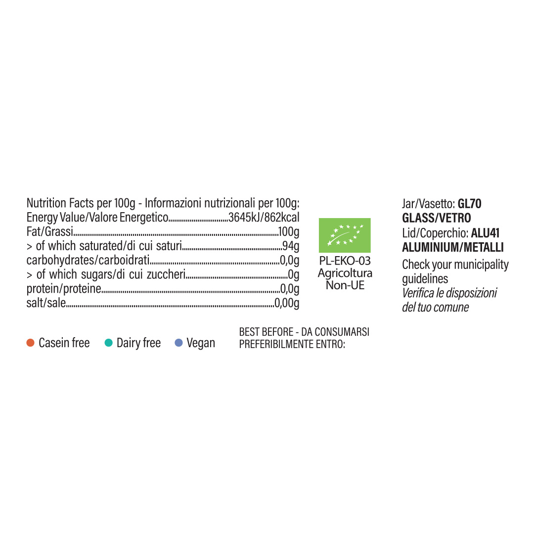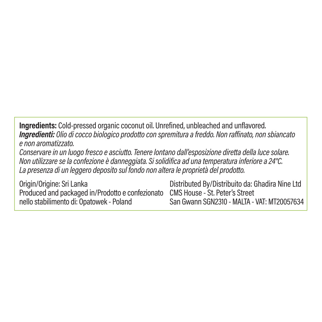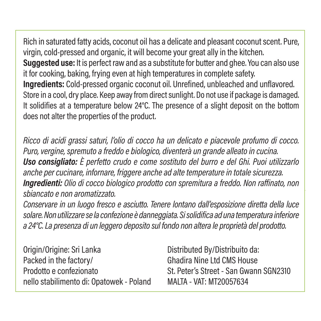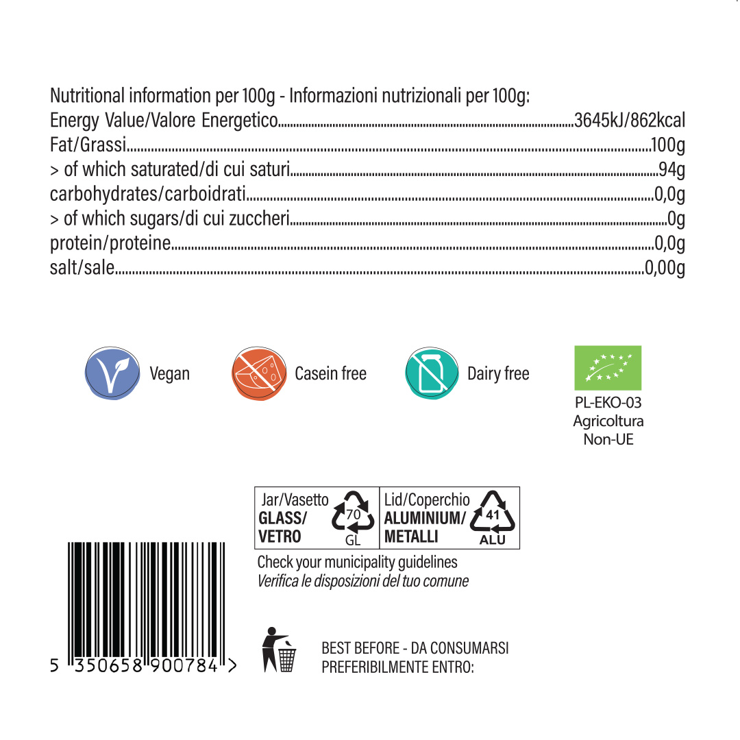 Olio di cocco vergine, premuto a freddo e biologico. È un prodotto al naturale che non subisce sbiancamenti, processi termici o chimici.