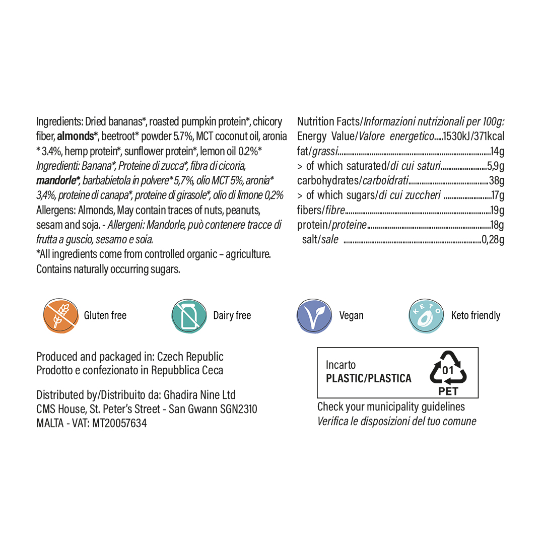 La Protein Bar Banana and Berry è ricca di proteine di canapa, girasole e zucca, che ti saziano più dei carboidrati e ti aiutano a controllare il peso.