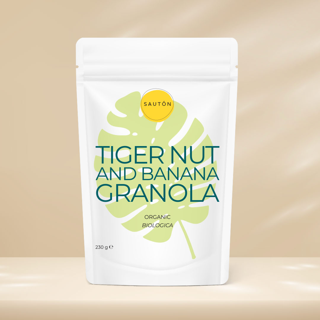 Granola Chufa e Banana: Questo muesli croccante e senza glutine è un ottimo accompagnamento per il tuo shake.