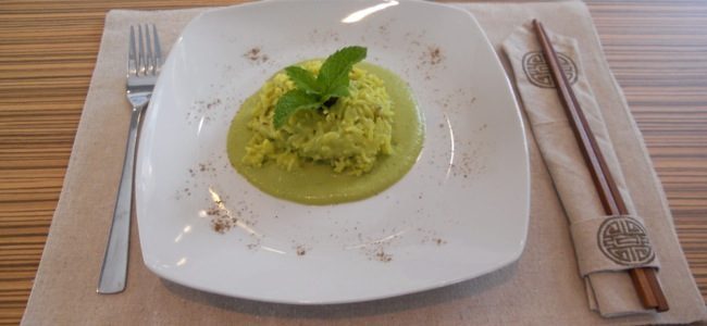 6. Servi disponendo sul fondo un po’ di crema e sopra un paio di cucchiai di riso basmati