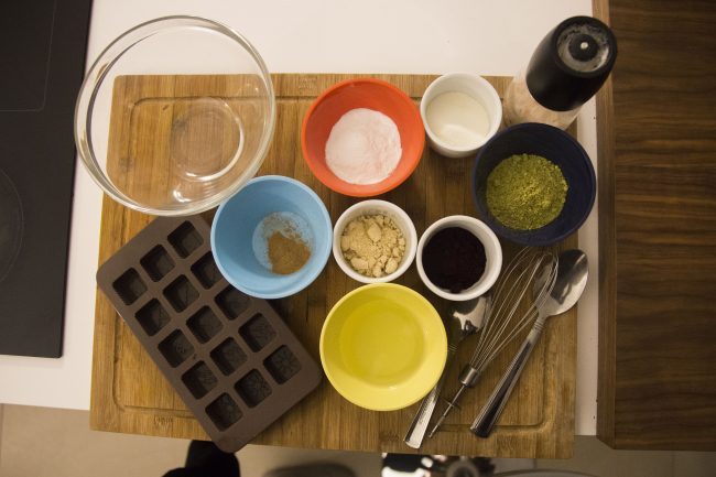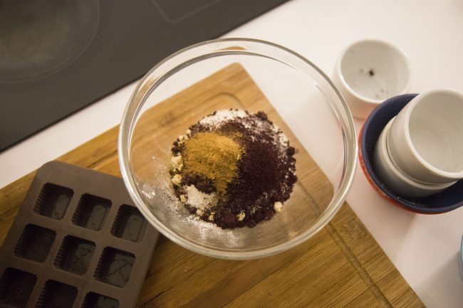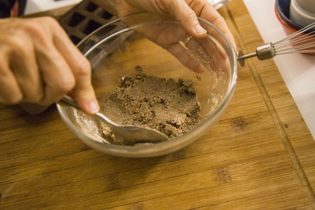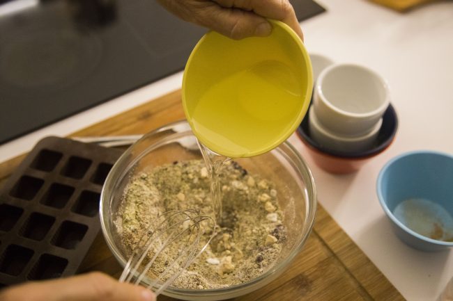 2. Se l’olio di cocco è solido fallo sciogliere a fuoco basso oppure a bagno maria, poi aggiungilo alle polveri