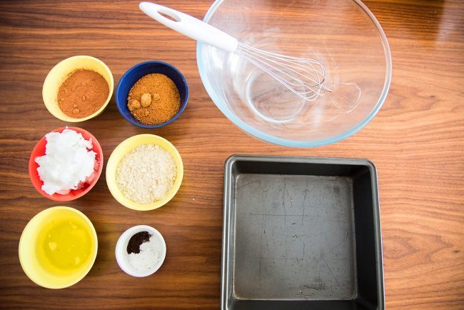 3. Ungi una teglia quadrata con olio evo e cospargila di farina di cocco, distribuisci il composto nella teglia e livellalo per bene